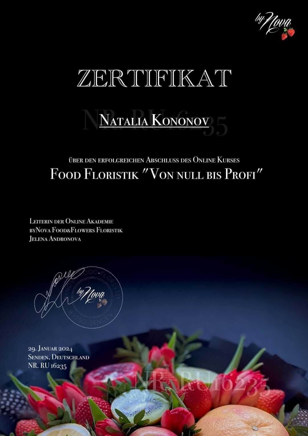 „Food Floristik – Von null bis Profi“ erfolgreich abgeschlossen und bringt das nötige Know-how mit, um jede Idee professionell und geschmackvoll umzusetzen.